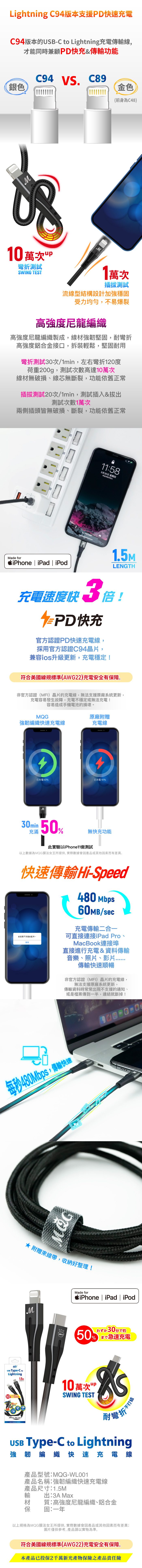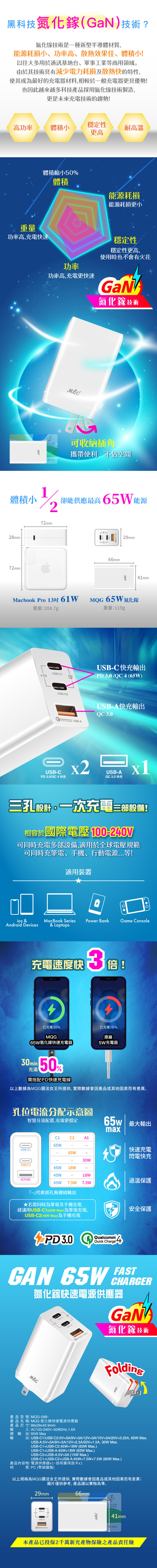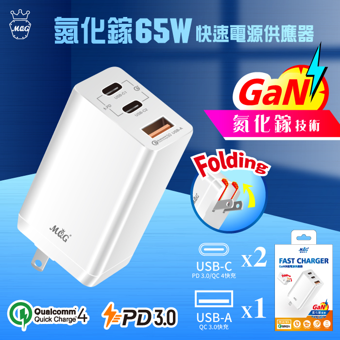 MQG GaN氮化鎵65W快速電源供應器 + USB Type-C to Lightning 1.5M強韌編織快速充電線 組合包